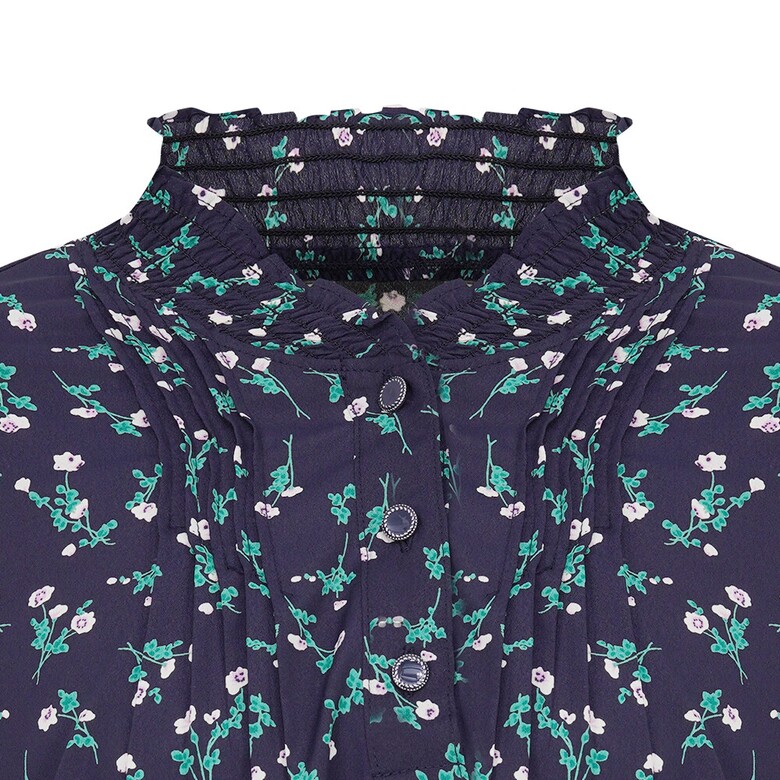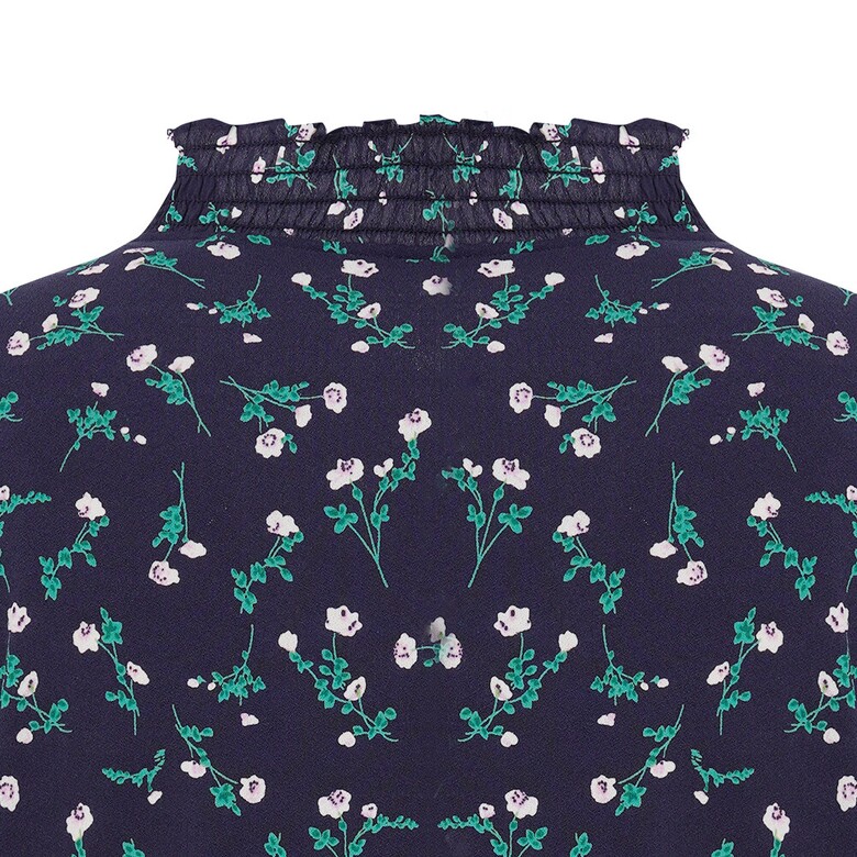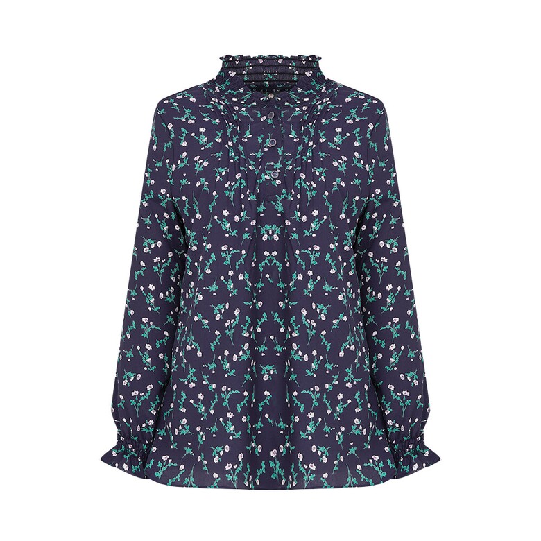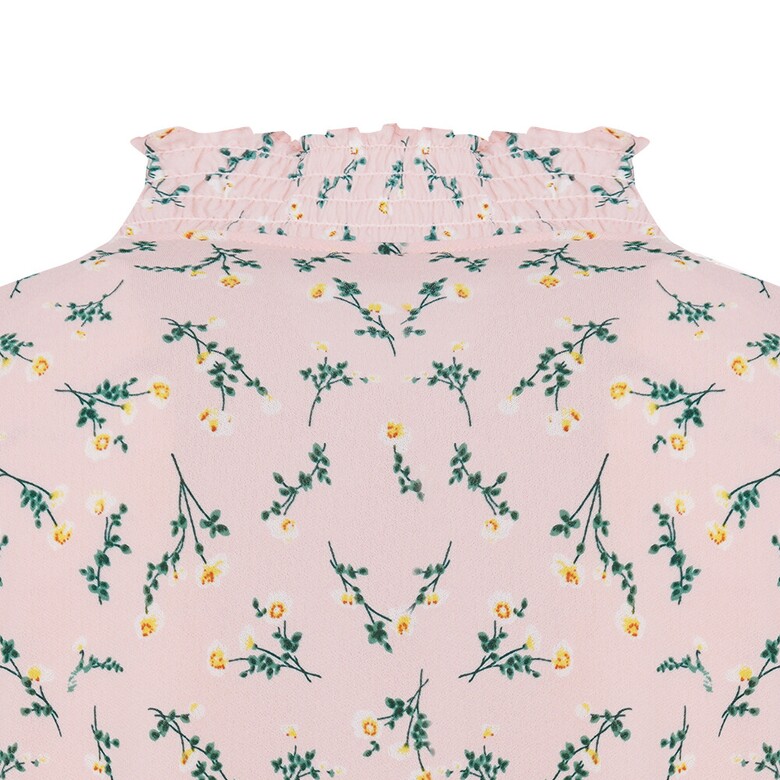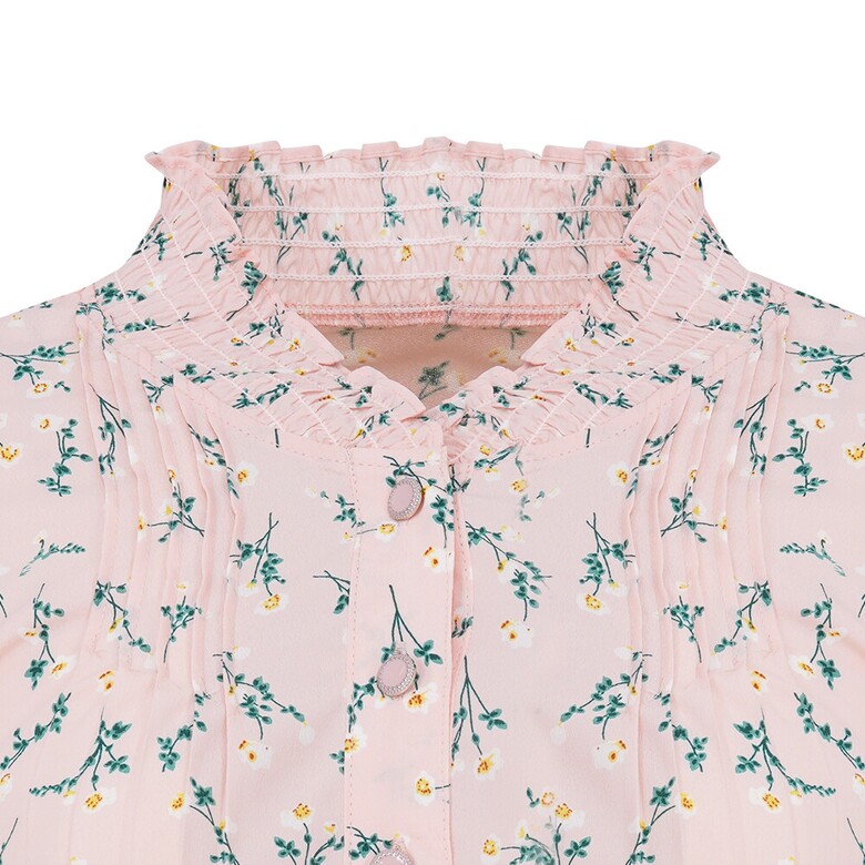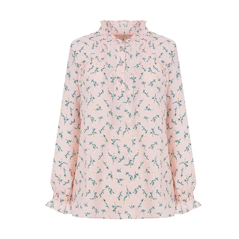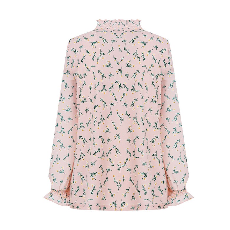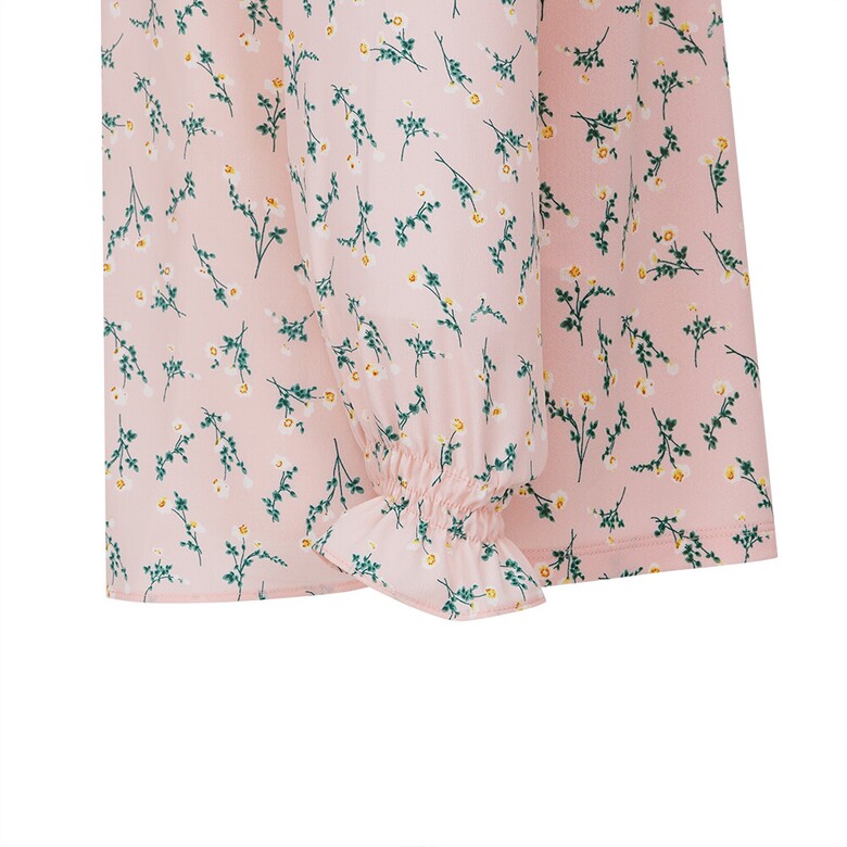 잔잔한 플라워 프린트로 여성스러운 코디가 가능하며 소매와 네크라인의 스모킹으로 활동하기 용이한 아이템입니다