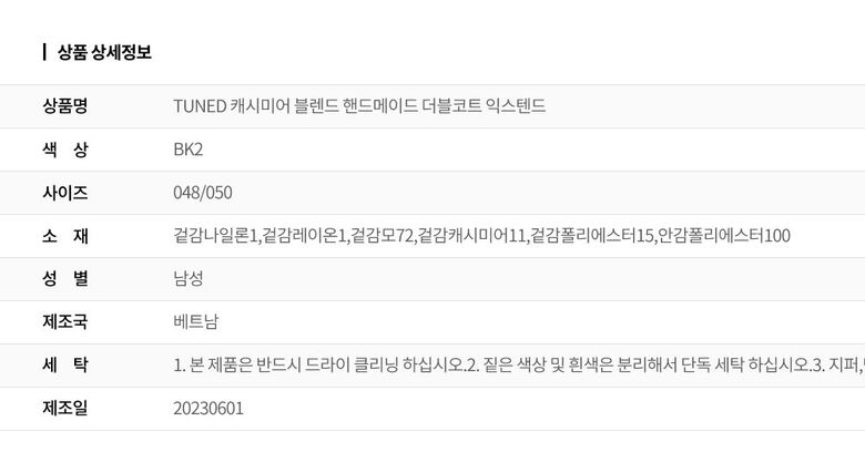 | 1. 제품 소재 (섬유의 조성 또는 혼용률을 백분율로 표시, 기능성인 경우 성적서 또는 허가서) | 겉감나일론1,겉감레이온1,겉감모72,겉감캐시미어11,겉감폴리에스터15,안감폴리에스터100 |