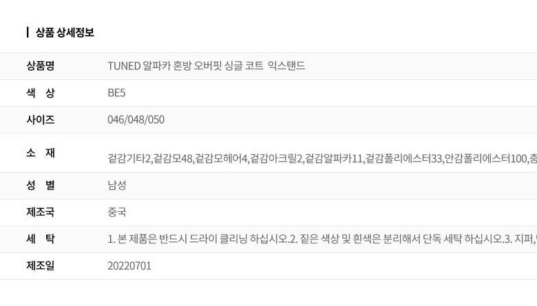 | 1. 제품 소재 (섬유의 조성 또는 혼용률을 백분율로 표시, 기능성인 경우 성적서 또는 허가서) | 겉감기타2,겉감모48,겉감모헤어4,겉감아크릴2,겉감알파카11,겉감폴리에스터33,안감폴리에스터100,충전재폴리에스터100 |