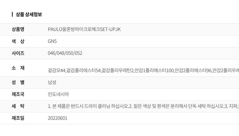| 1. 제품 소재 (섬유의 조성 또는 혼용률을 백분율로 표시, 기능성인 경우 성적서 또는 허가서) | 겉감모44,겉감폴리에스터54,겉감폴리우레탄2,안감1폴리에스터100,안감2폴리에스터96,안감2폴리우레탄4 |
