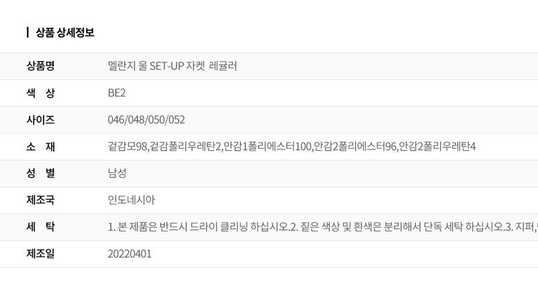 | 1. 제품 소재 (섬유의 조성 또는 혼용률을 백분율로 표시, 기능성인 경우 성적서 또는 허가서) | 겉감모98,겉감폴리우레탄2,안감1폴리에스터100,안감2폴리에스터96,안감2폴리우레탄4 |