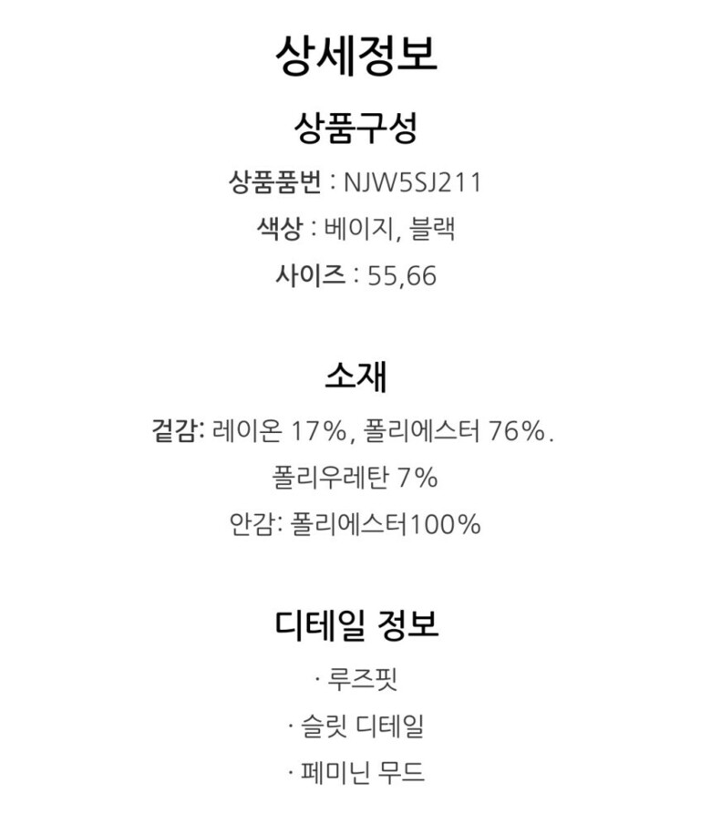 | 1. 제품 소재 (섬유의 조성 또는 혼용률을 백분율로 표시, 기능성인 경우 성적서 또는 허가서) | 상품상세참조 |