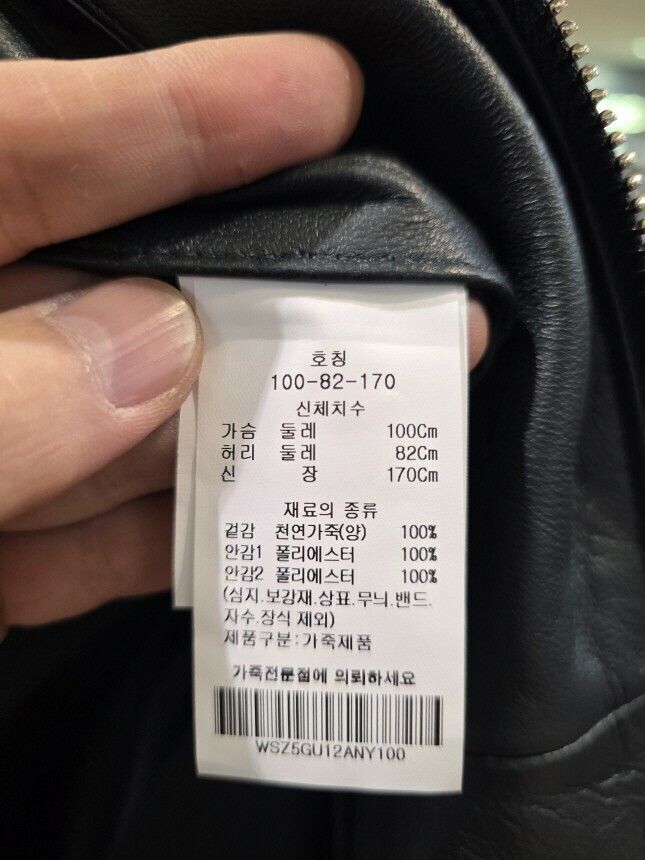 | 1. 제품 소재 (섬유의 조성 또는 혼용률을 백분율로 표시, 기능성인 경우 성적서 또는 허가서) | 겉감 : 천연가죽 (양가죽) 100% 안감1 : 폴리에스터 100% 안감2 : 폴 |