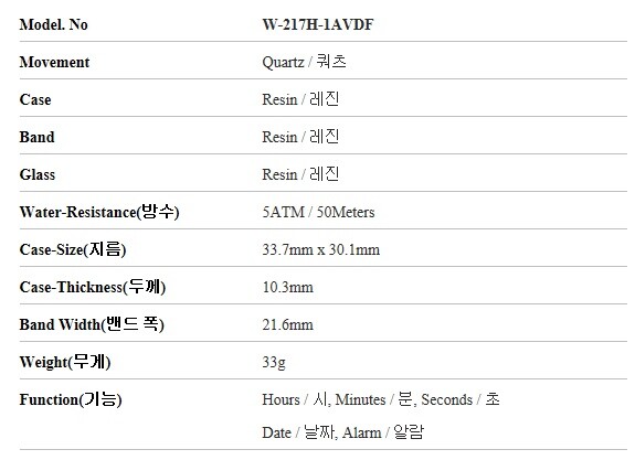 카시오 시계 W-217H-1AVDF (W-217H-1A) 스탠다드디지털 스포츠 남성우레탄시계 당일발송