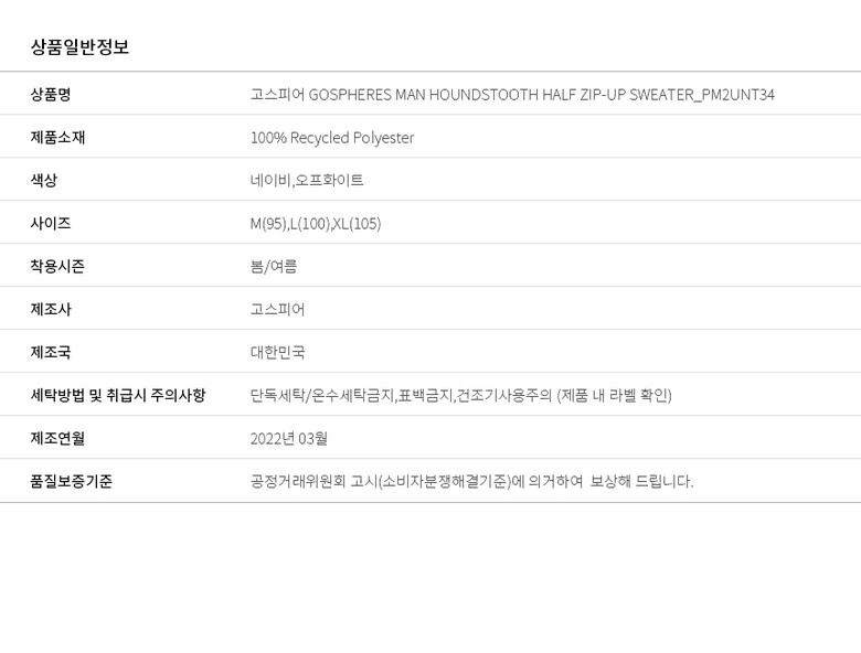 | 6. 세탁방법 및 취급시 주의사항 | 단독세탁/온수세탁금지,표백금지,건조기사용주의 (제품 내 라벨 확인) |