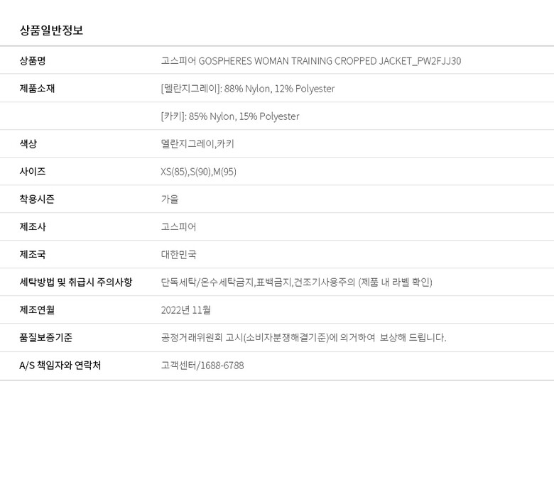 | 1. 제품 소재 (섬유의 조성 또는 혼용률을 백분율로 표시, 기능성인 경우 성적서 또는 허가서) | [카키]: 85% Nylon, 15% Polyester / [멜란지그레이]: 88% Nylon, 12% Polyester |