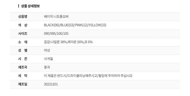 | 1. 제품 소재 (섬유의 조성 또는 혼용률을 백분율로 표시, 기능성인 경우 성적서 또는 허가서) | 상품상세참조 |