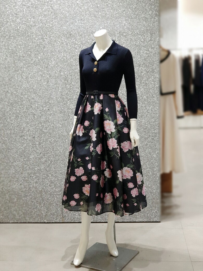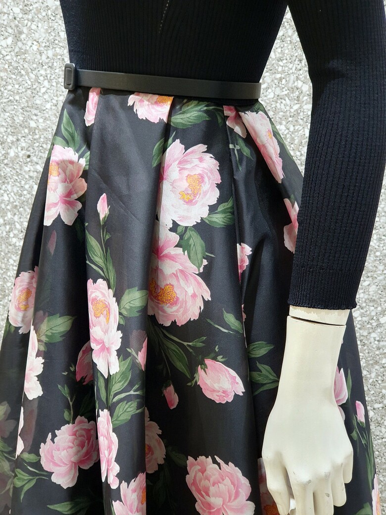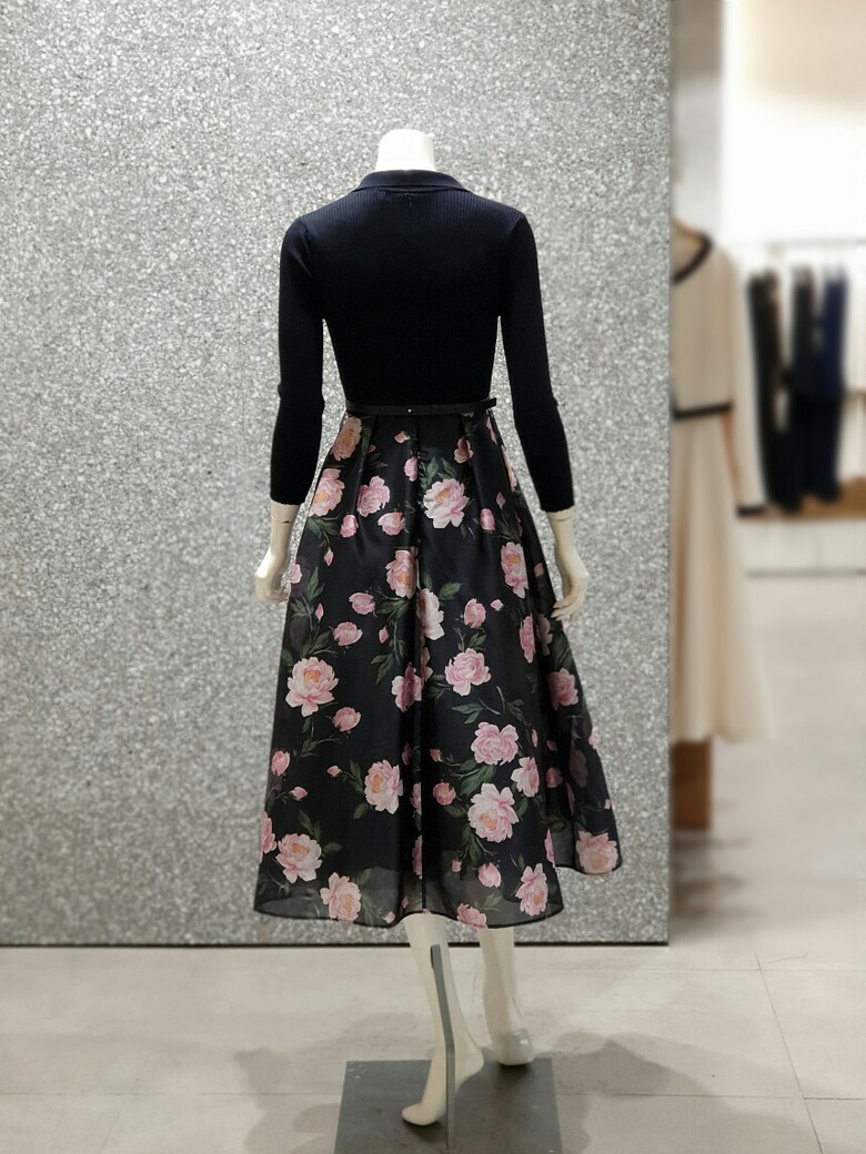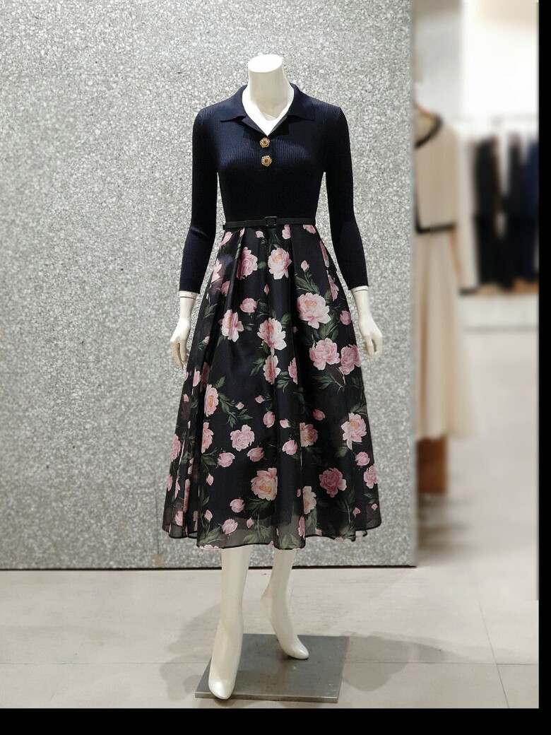 플라워 패턴의 플레어스커트와 상의 니트 텍스처가 더해져
