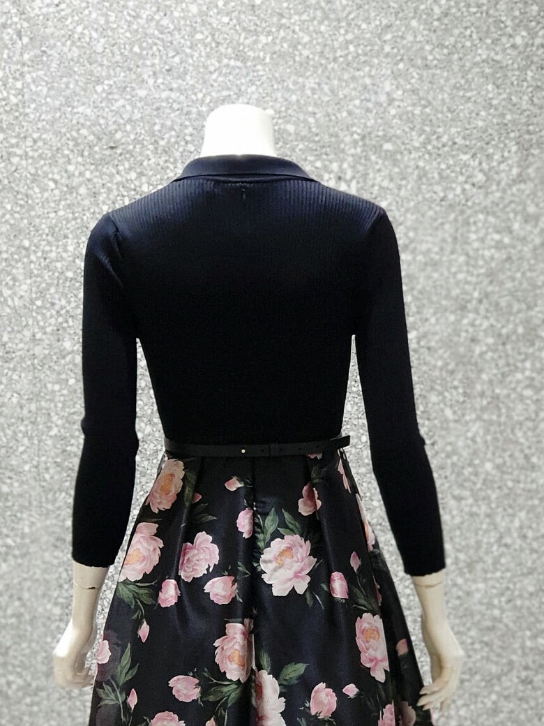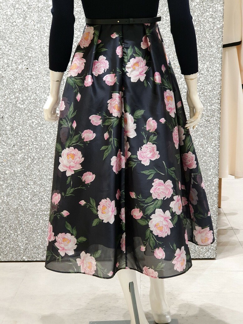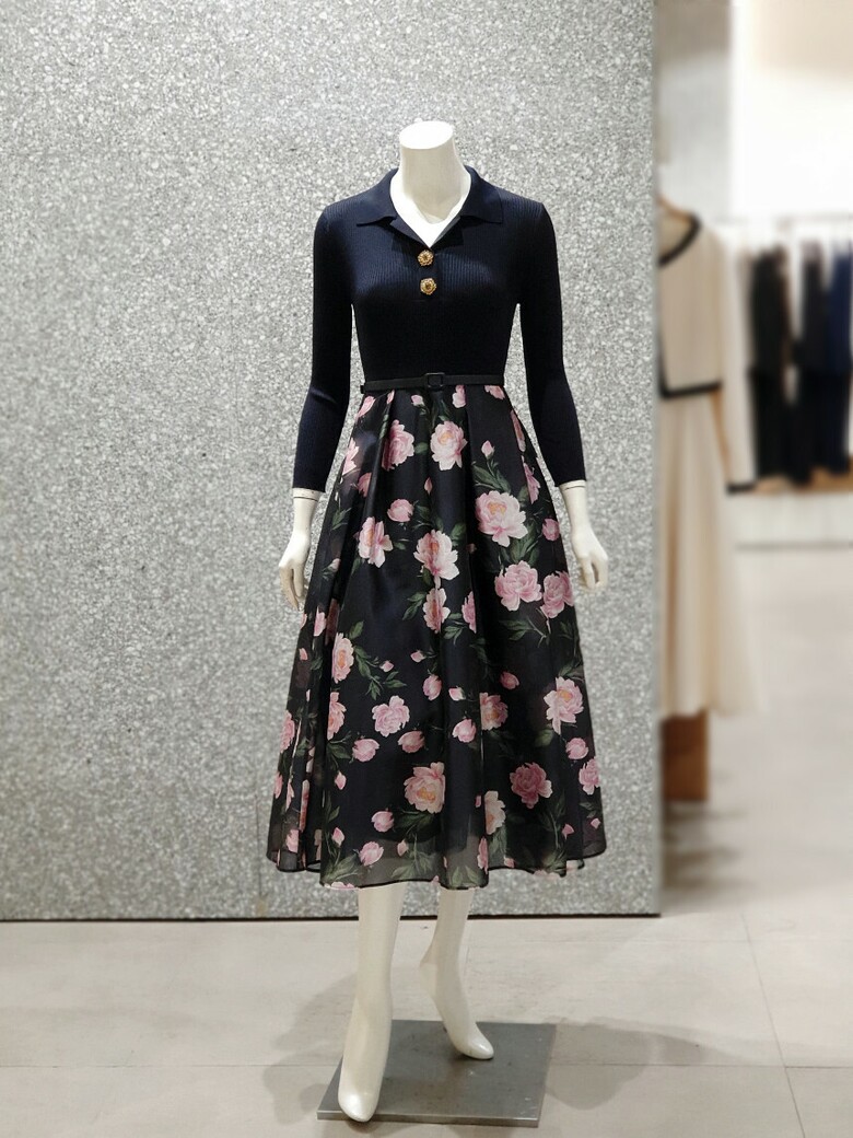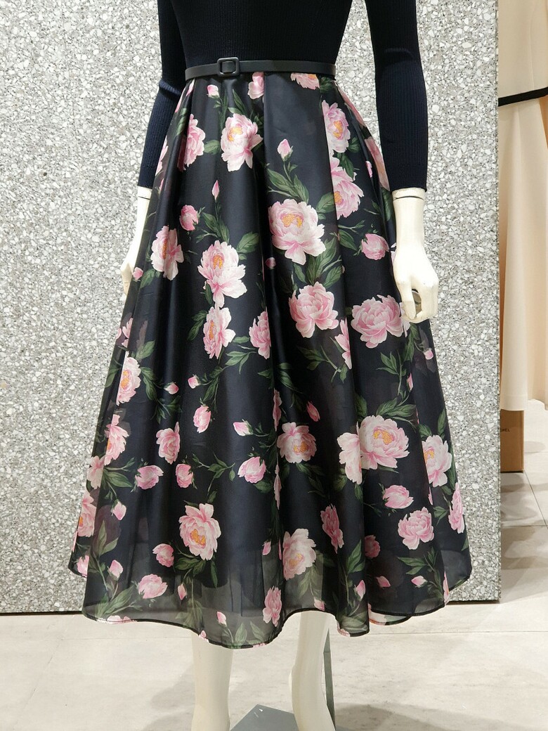 플라워 패턴의 플레어스커트와 상의 니트 텍스처가 더해져