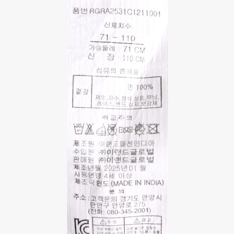 | 1. 제품 소재 (섬유의 조성 또는 혼용률을 백분율로 표시, 기능성인 경우 성적서 또는 허가서) | 상품상세참조 |