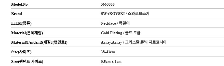 | 1. 소재 / 순도 / 밴드재질 | 골드 / 쥬얼리 - 골드 도금 / 팬던트 - 크리스탈 |
