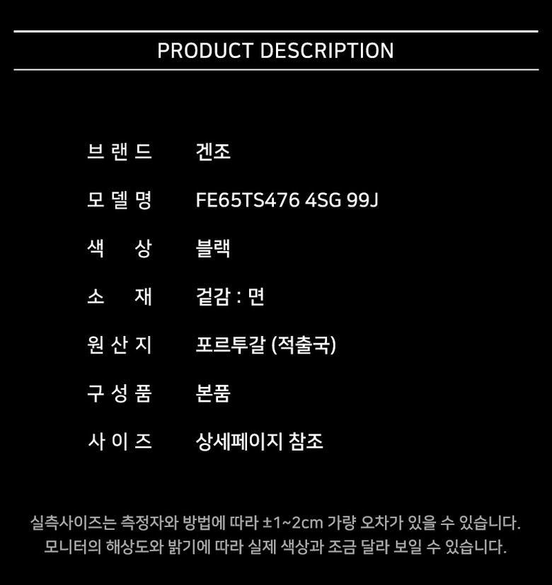 | 1. 제품 소재 (섬유의 조성 또는 혼용률을 백분율로 표시, 기능성인 경우 성적서 또는 허가서) | 상세페이지 참조 |