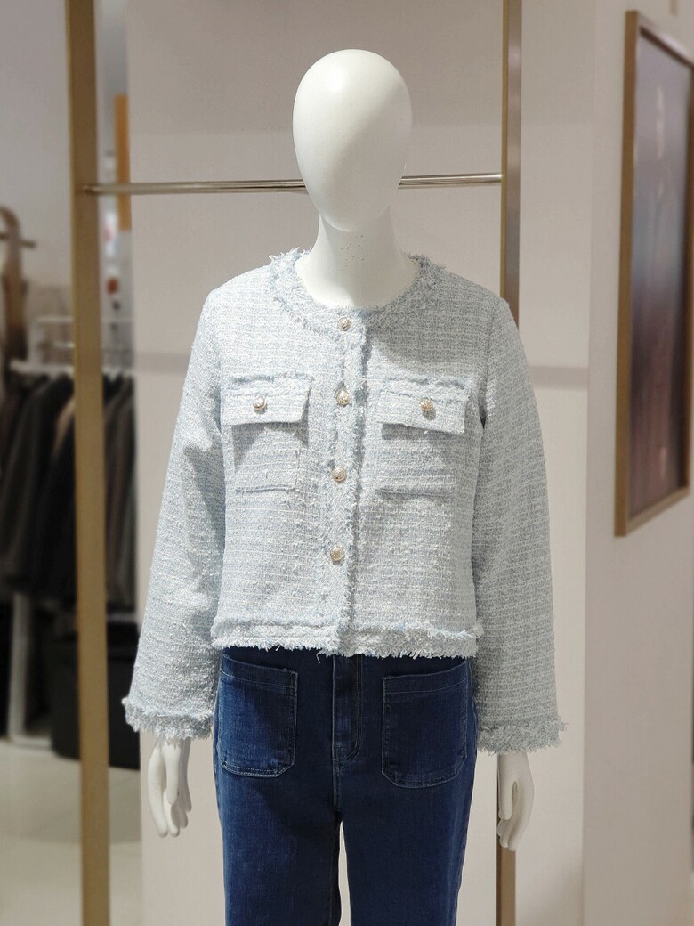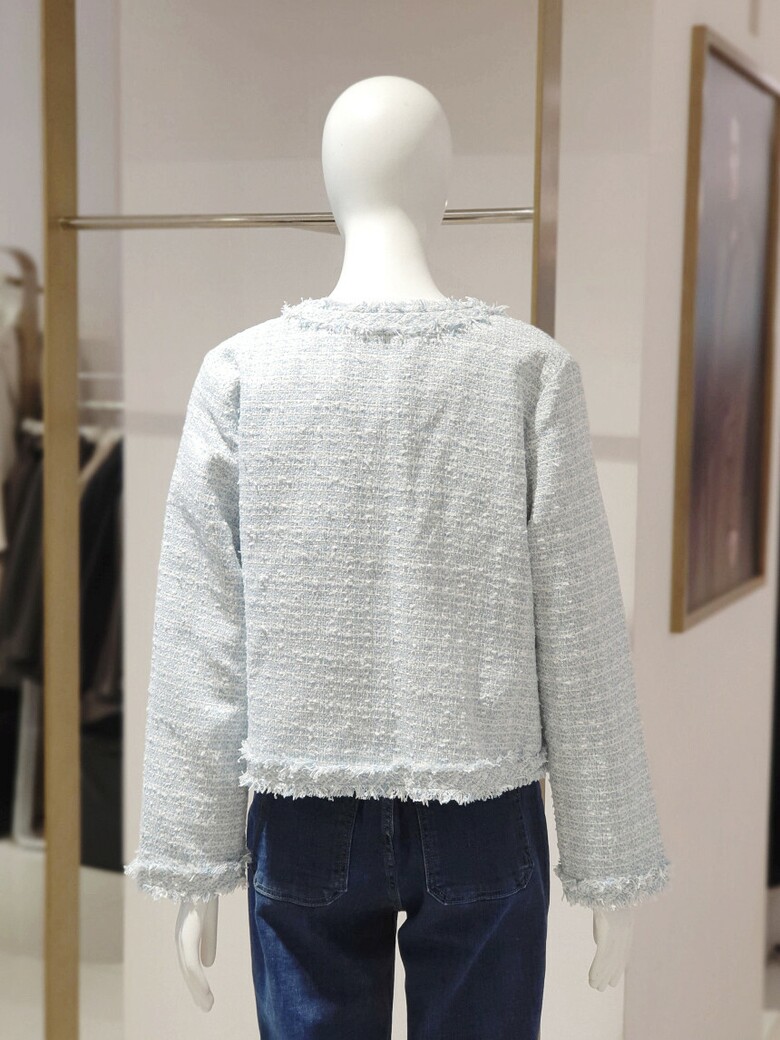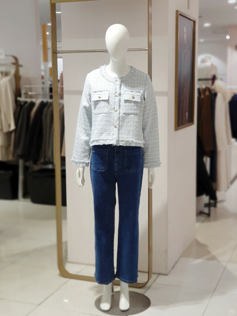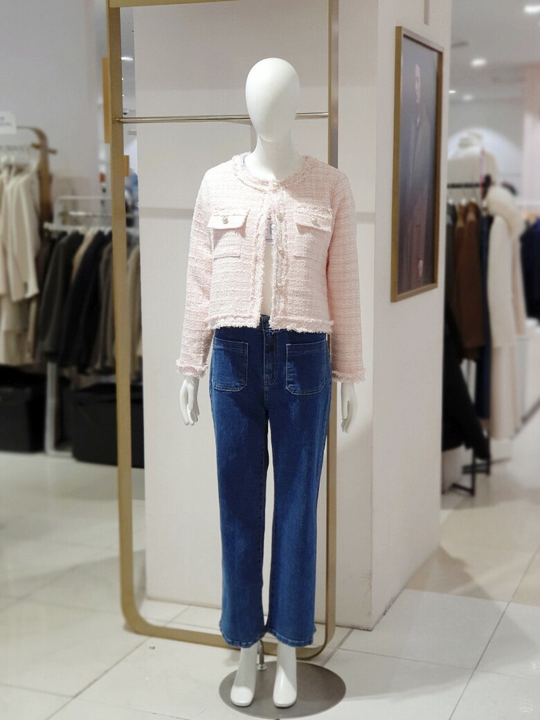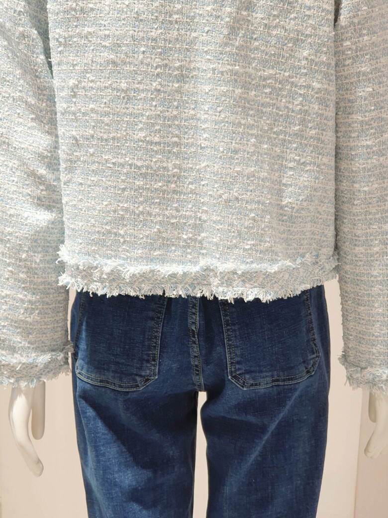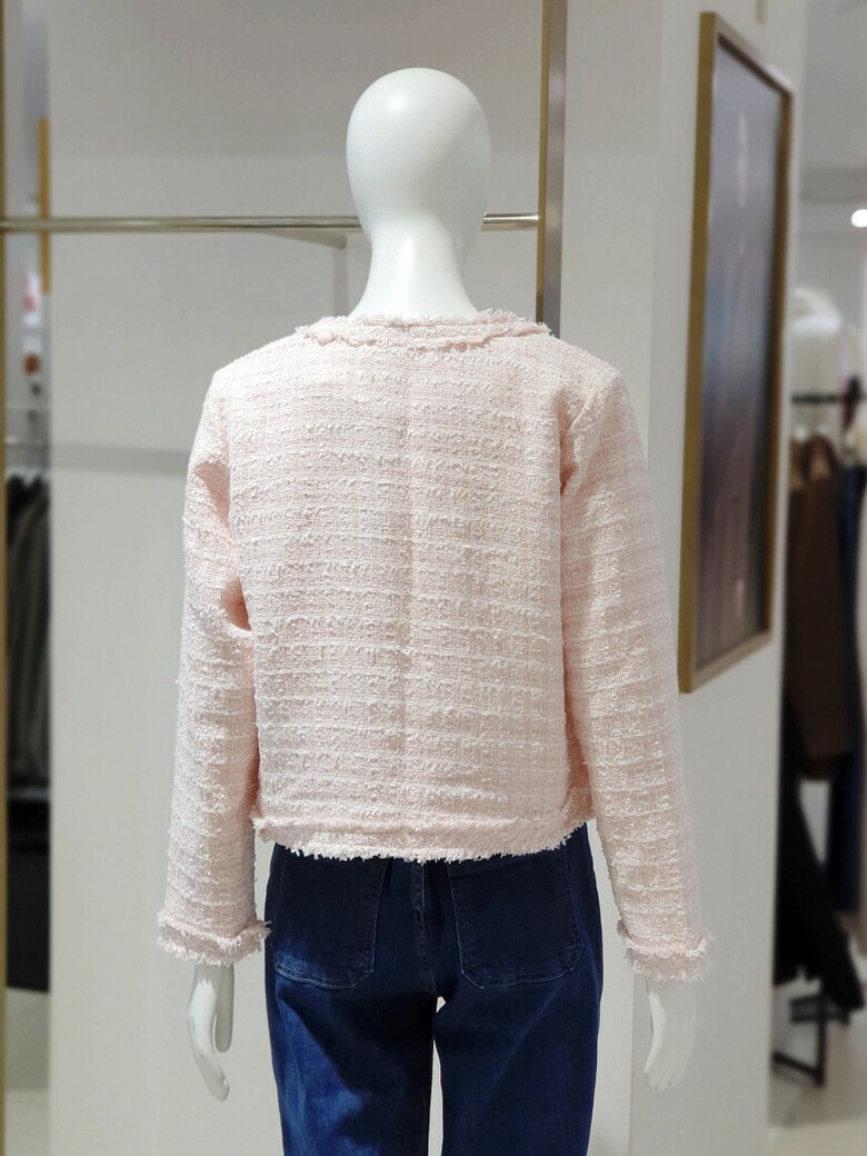 가장자리 프린지 디테일이 어우러진 재킷입니다.