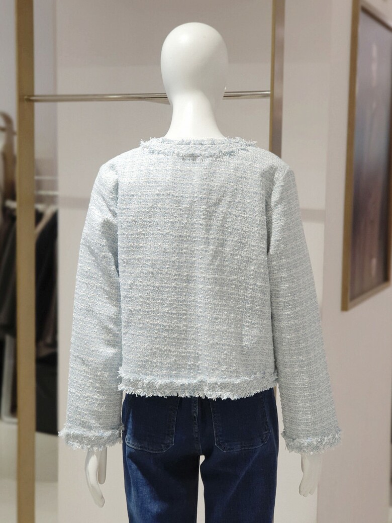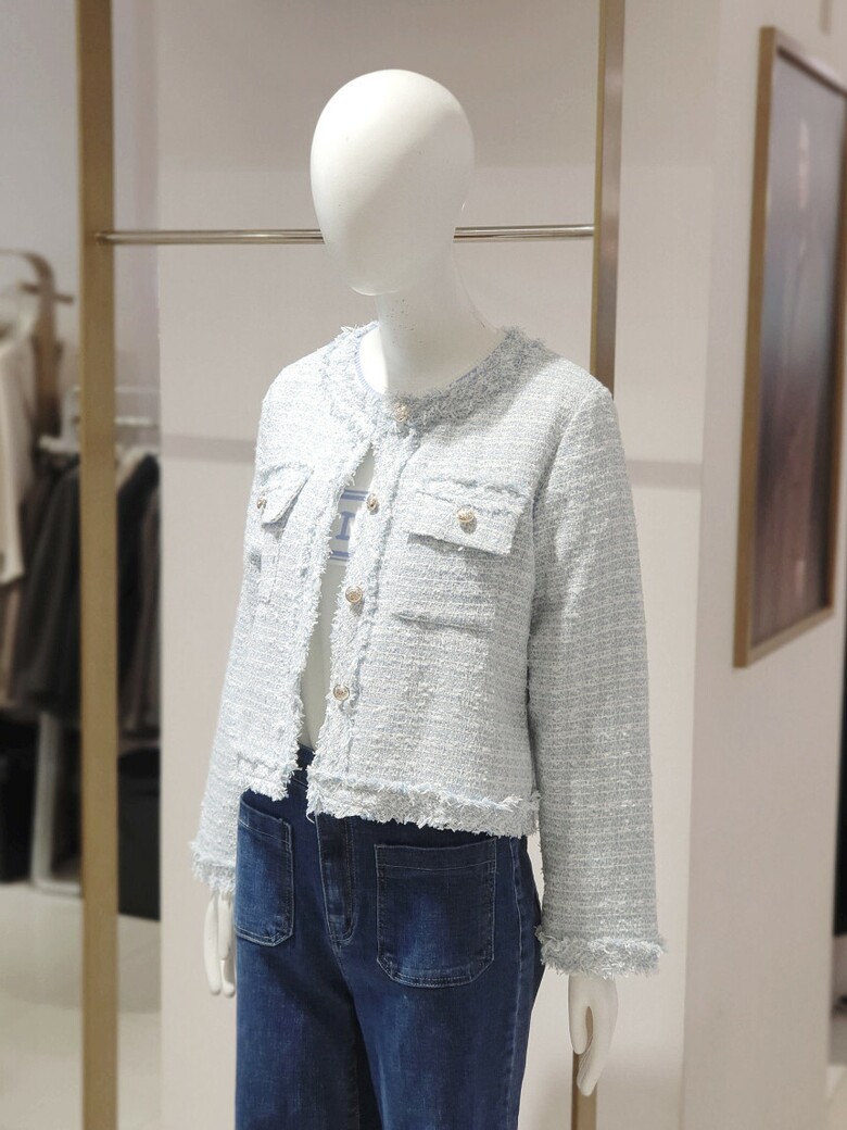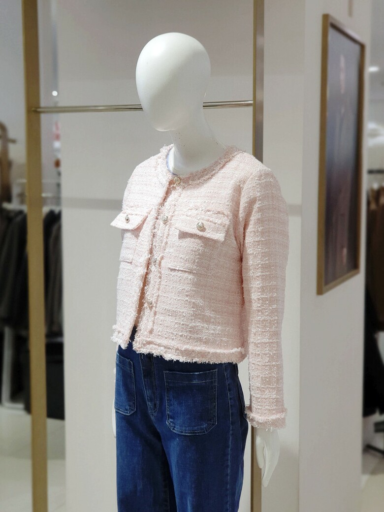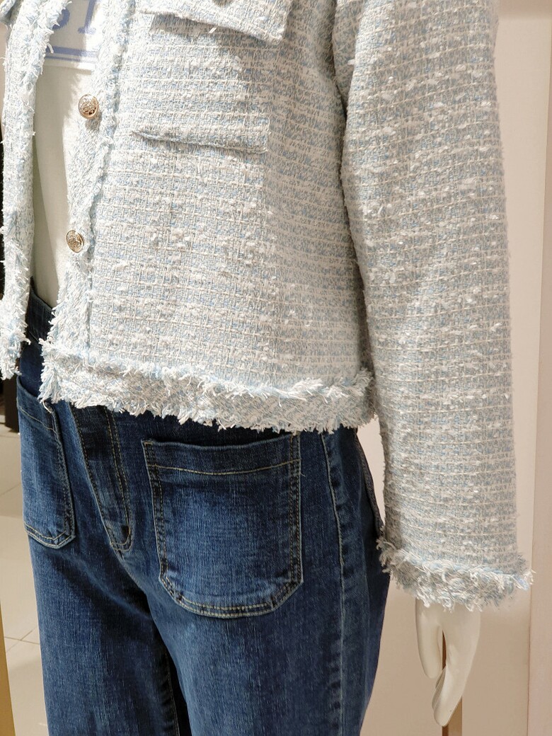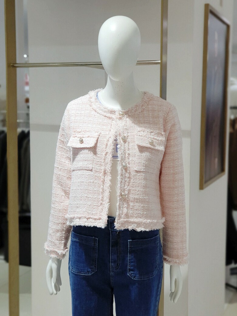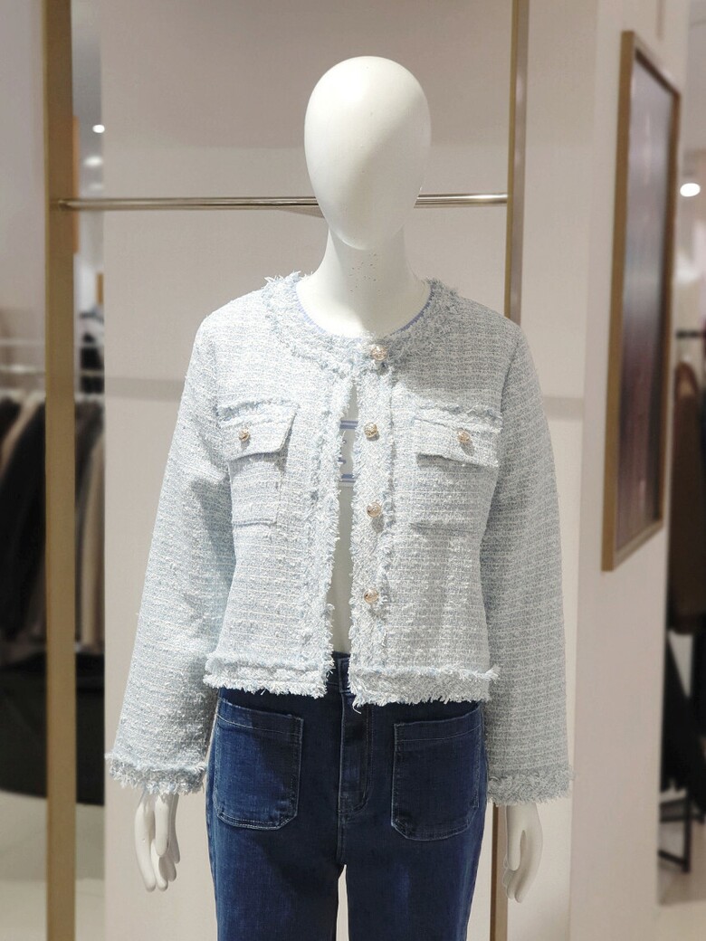 가장자리 프린지 디테일이 어우러진 재킷입니다.