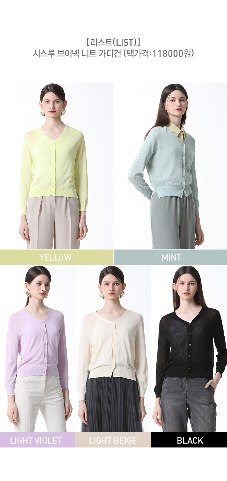▶ ITEM : 시스루 브이넥 니트 가디건 ▶ NUMBER : TSKCDM62510 ▶ FABRIC : [겉감] 레이온 88%, 나일론 12% ▶ WASHING : 고온건조, 고온다림질불가 ▶ 원 산 지 : 중 국 ▶ 색 상 : 옐로우(YE), 민트(MI), 라이트바이올렛(LV), 라이트베이지(LB), 블랙(BK)