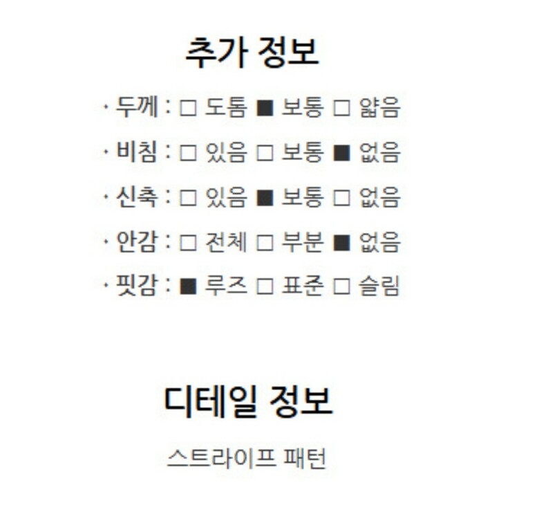 | 1. 제품 소재 (섬유의 조성 또는 혼용률을 백분율로 표시, 기능성인 경우 성적서 또는 허가서) | 상품상세참조 |