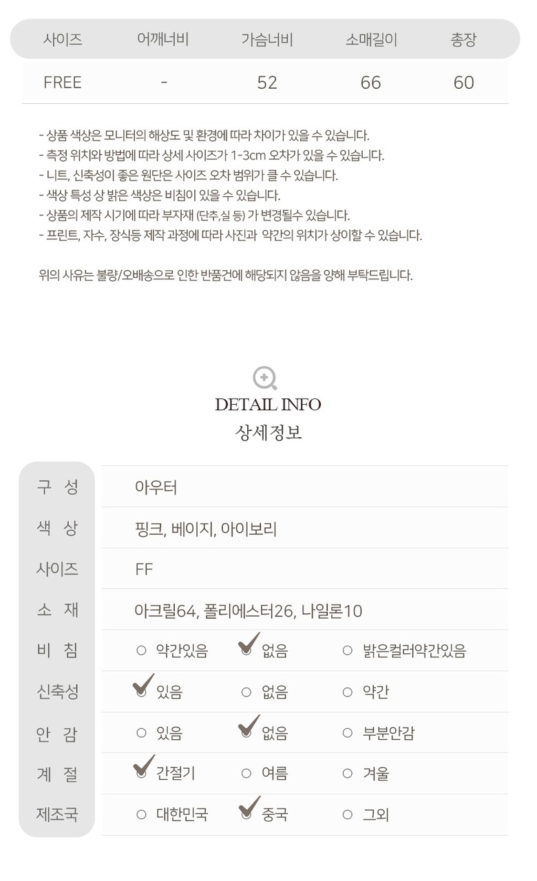 • 처음 배송된 상품상태와 다를 경우(세탁/착용 후 외출하신 경우) 반품이 불가합니다.