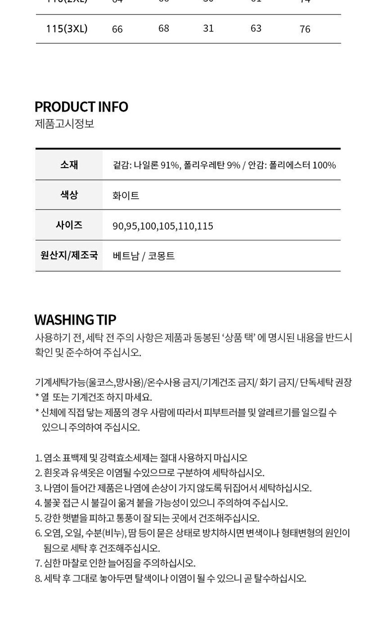 | 1. 제품 소재 (섬유의 조성 또는 혼용률을 백분율로 표시, 기능성인 경우 성적서 또는 허가서) | 겉감 : 나일론 91% 폴리우레탄 9%, 안감 : 폴리에스터 100% |
