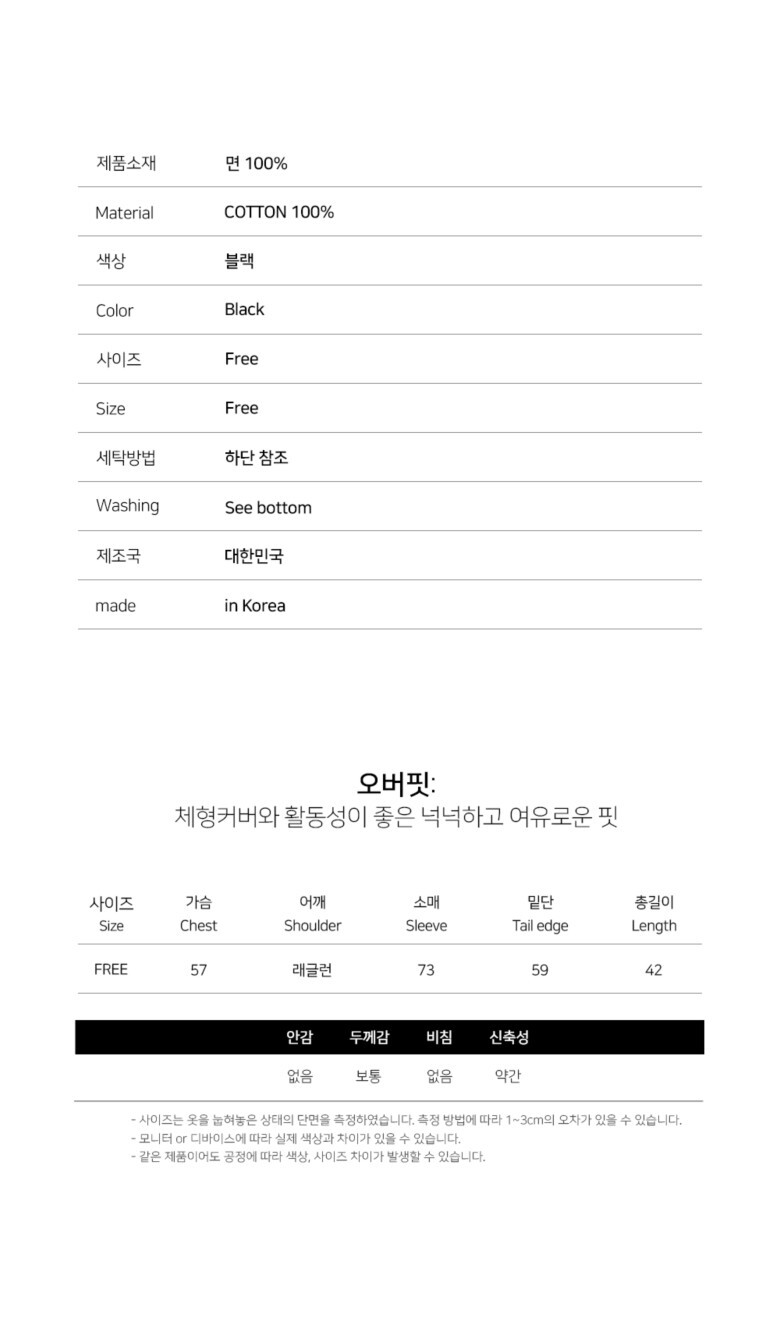 | 1. 제품 소재 (섬유의 조성 또는 혼용률을 백분율로 표시, 기능성인 경우 성적서 또는 허가서) | 면 100% |