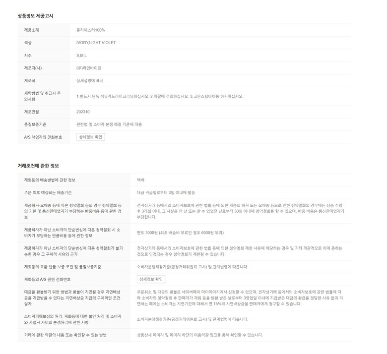 | 6. 세탁방법 및 취급시 주의사항 | 상품상세참조 |