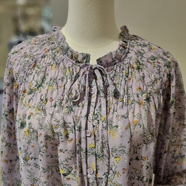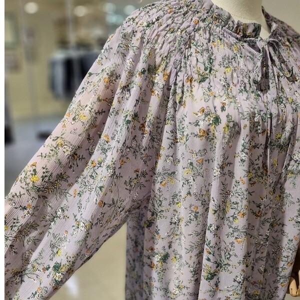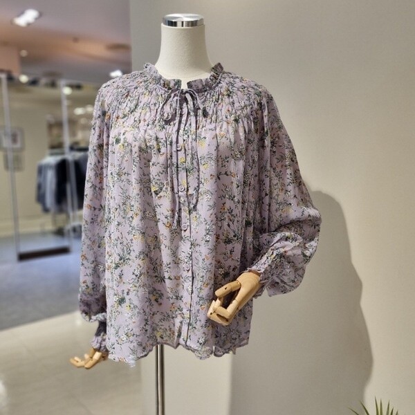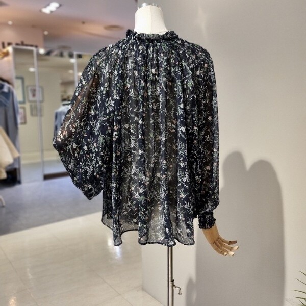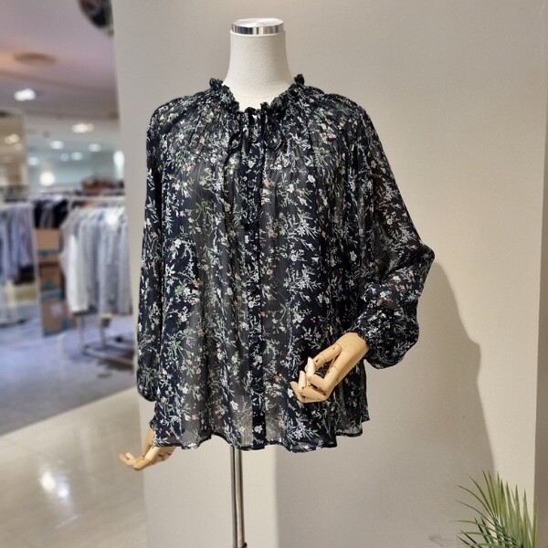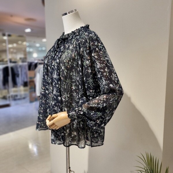 전체적인 셔링으로 여유로운 핏. 약간의 비침. 쉬폰소재의 가벼움