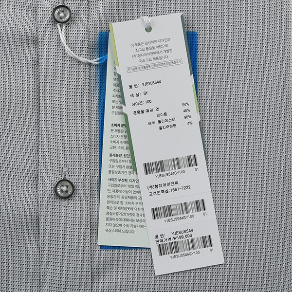 제품소재 : (겉감 면54%/레이온46%) (배색 폴리에스터96%/폴리우레탄4%)
