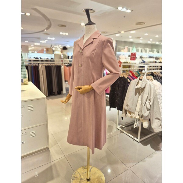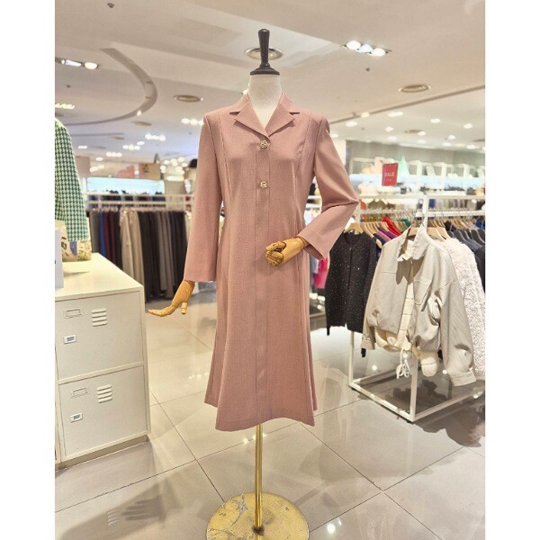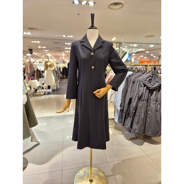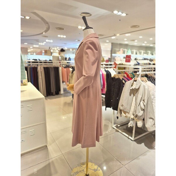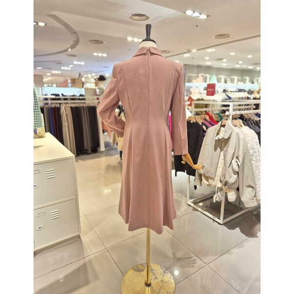 브이카라넥, 앞단추(여밈불가), 손목까지 오는 소매 길이, 뒷지퍼, 아주 살짝 퍼지는 A라인,바디라인 안감 있음, 신축성 있음
