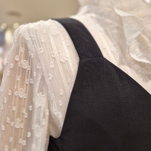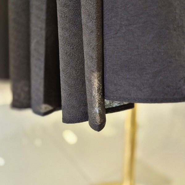 신축성 없는 바스락한 소재, 사이드포켓, 스커트 플리츠 부분 소재 다름, 앞뒤 언발기장