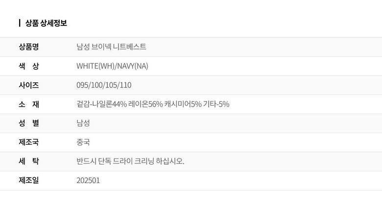 1. 제품 소재 (섬유의 조성 또는 혼용률을 백분율로 표시, 기능성인 경우 성적서 또는 허가서) 겉감-나일론44% 레이온56% 캐시미어5% 기타-5%