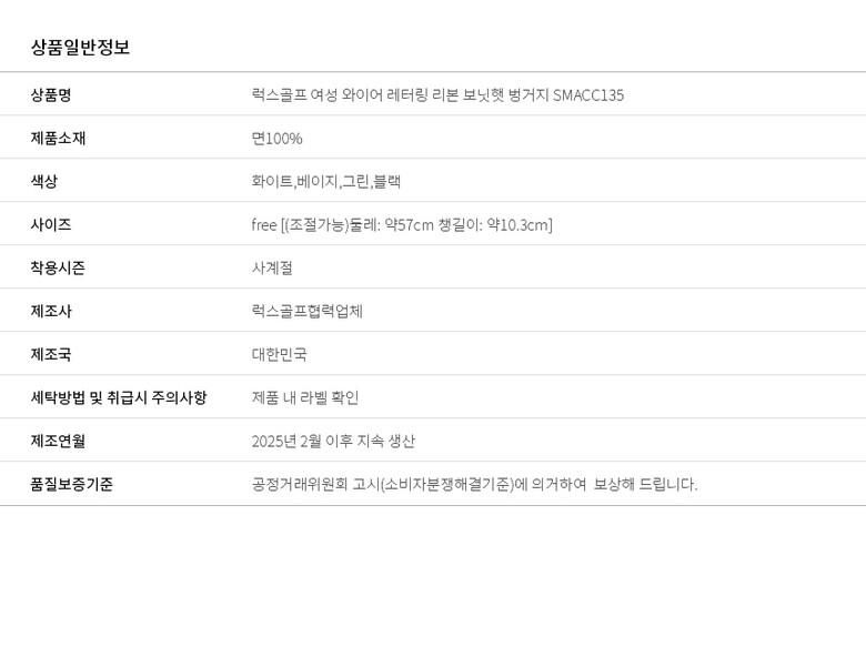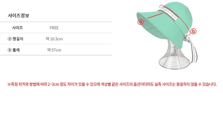 3. 치수 free[(조절가능)둘레: 약57cm 챙길이: 약10.3cm]