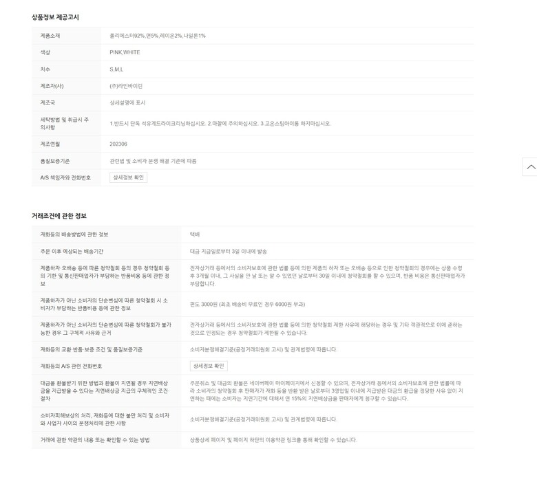 | 6. 세탁방법 및 취급시 주의사항 | 상품상세참조 |