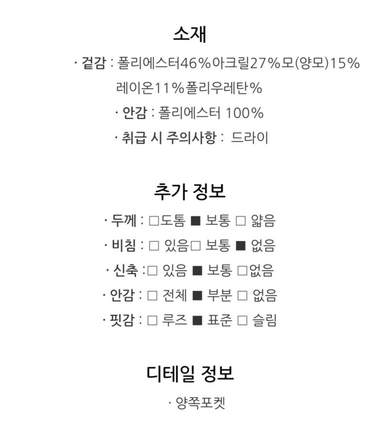| 1. 제품 소재 (섬유의 조성 또는 혼용률을 백분율로 표시, 기능성인 경우 성적서 또는 허가서) | 상품상세참조 |
