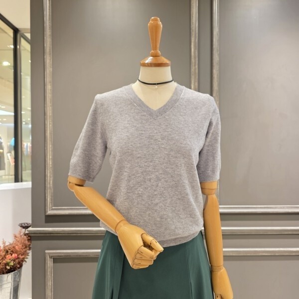 이너로 매치하시기 좋은 브이넥 반팔 니트입니다