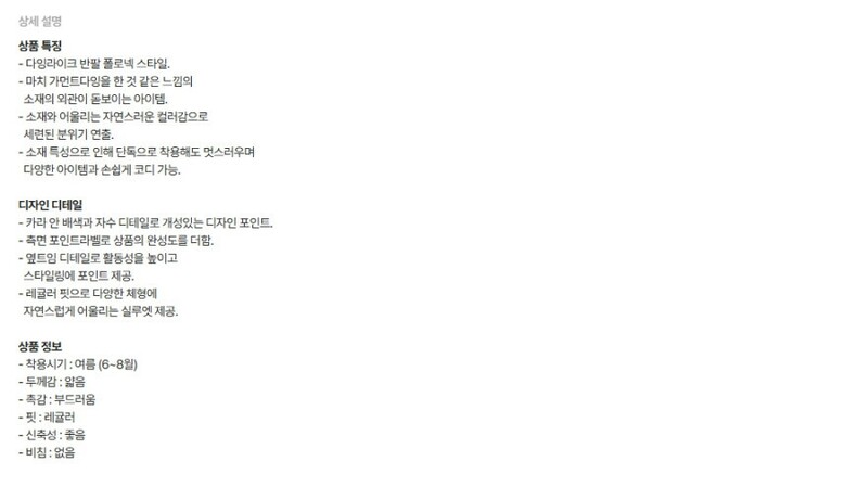 | 1. 제품 소재 (섬유의 조성 또는 혼용률을 백분율로 표시, 기능성인 경우 성적서 또는 허가서) | 상품상세참조 |