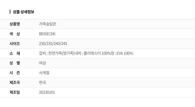 1. 제품 소재 (섬유의 조성 또는 혼용률을 백분율로 표시, 기능성인 경우 성적서 또는 허가서) 갑피 : 천연가죽(양가죽)