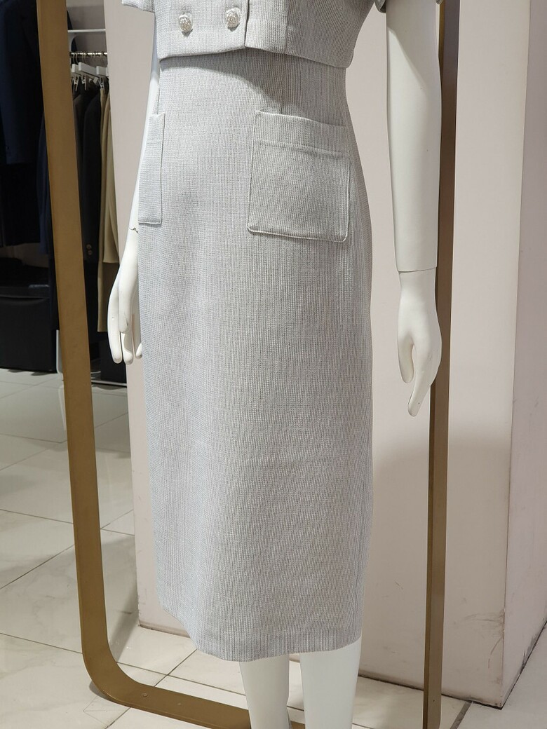 크롭 재킷 디자인의 상의에 더블 버튼 장식으로 포인트를 주며