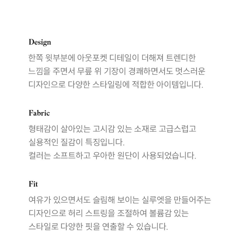 | 1. 제품 소재 (섬유의 조성 또는 혼용률을 백분율로 표시, 기능성인 경우 성적서 또는 허가서) | 상품상세참조 |