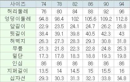 | 3. 치수 | 74(28~29),78(30~31),82(32~33),86(34~35),90(36),94(37~38) |