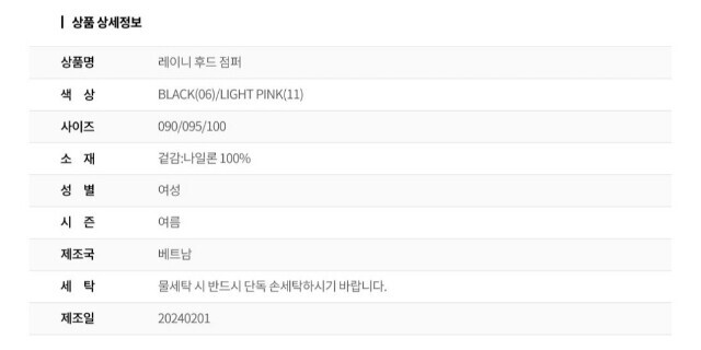 | 6. 세탁방법 및 취급시 주의사항 | 상품상세참조 |