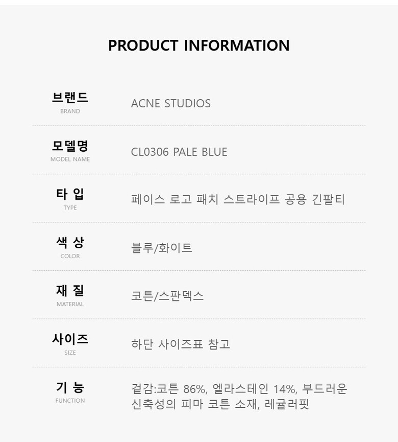 | 1. 제품 소재 (섬유의 조성 또는 혼용률을 백분율로 표시, 기능성인 경우 성적서 또는 허가서) | 상세페이지 참조 |