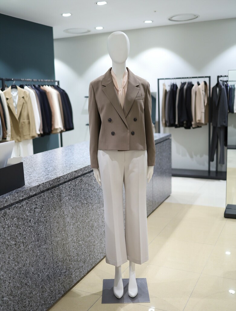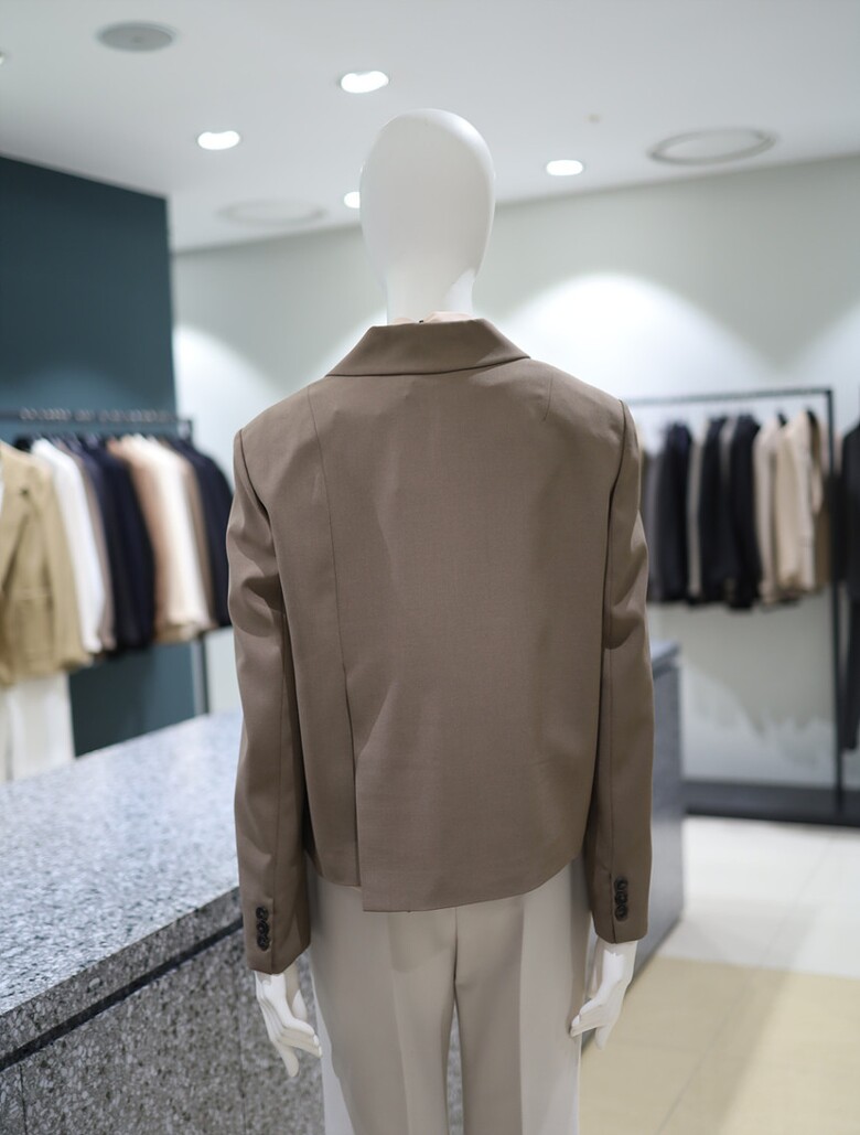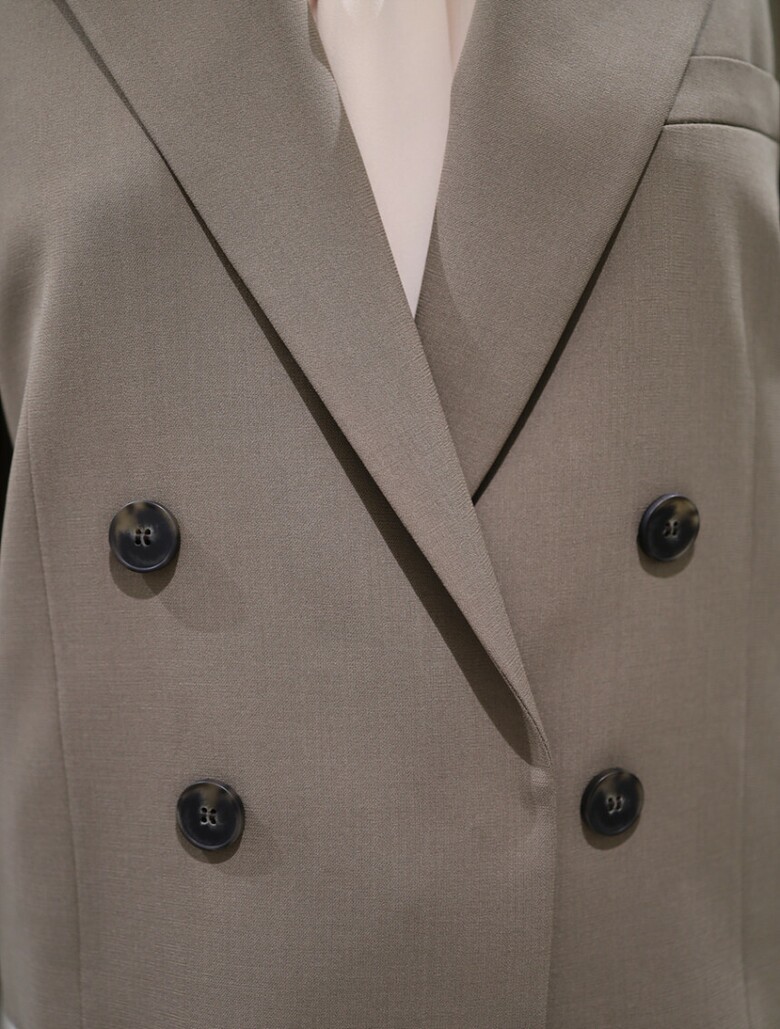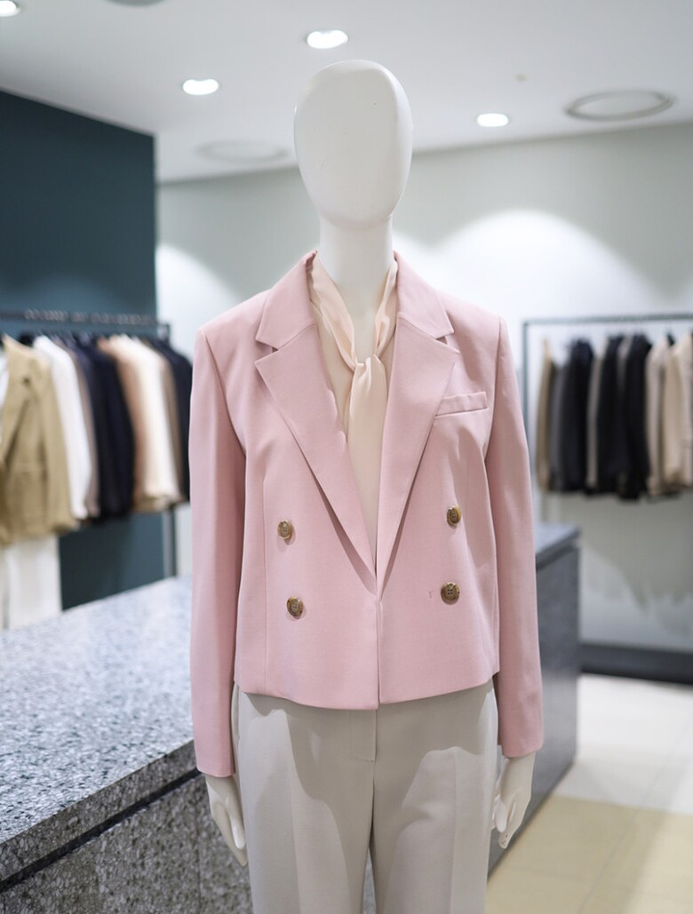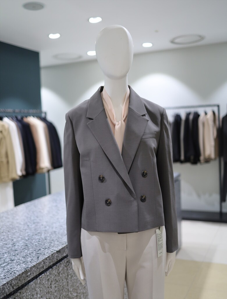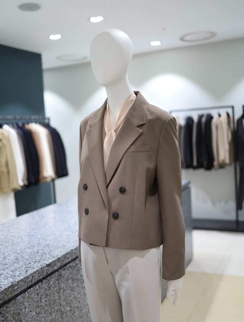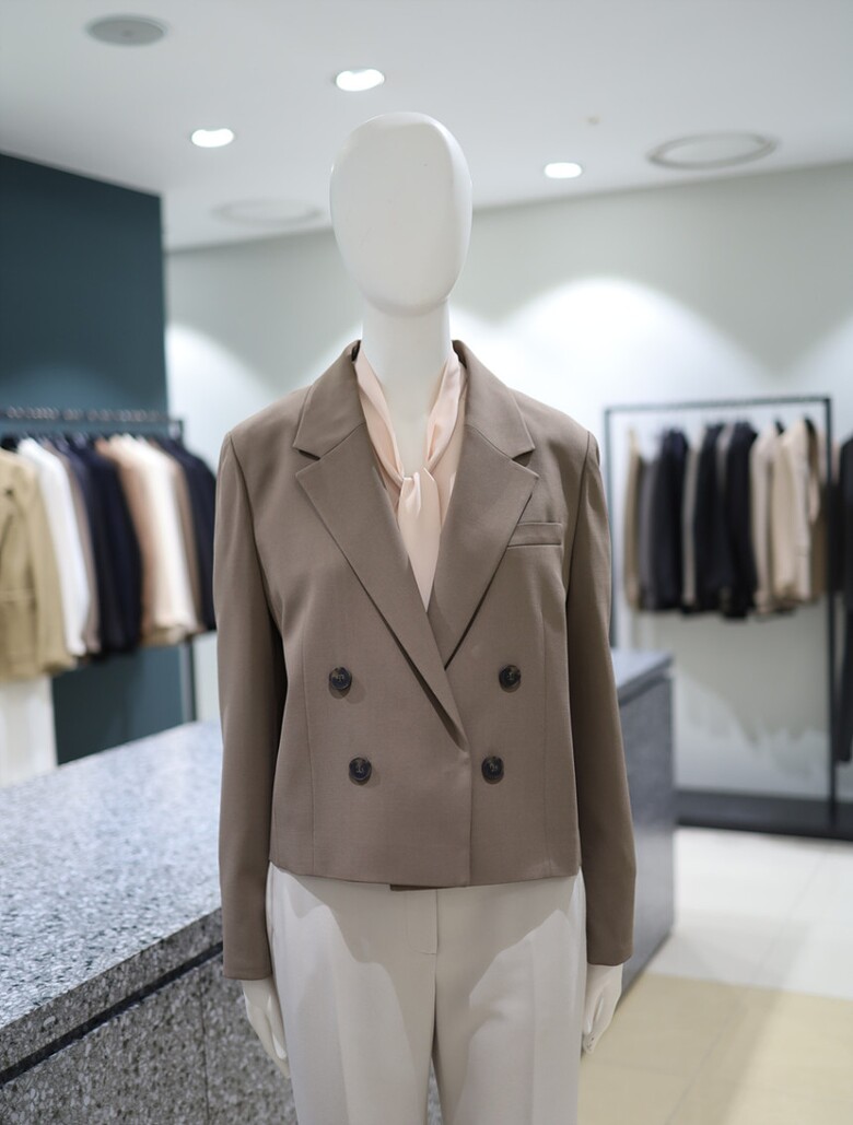 더블 버튼 클로징과 크롭 기장이 어우러진