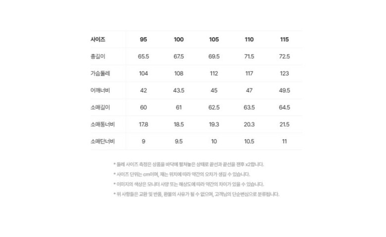 | 1. 제품 소재 (섬유의 조성 또는 혼용률을 백분율로 표시, 기능성인 경우 성적서 또는 허가서) | 상품상세참조 |