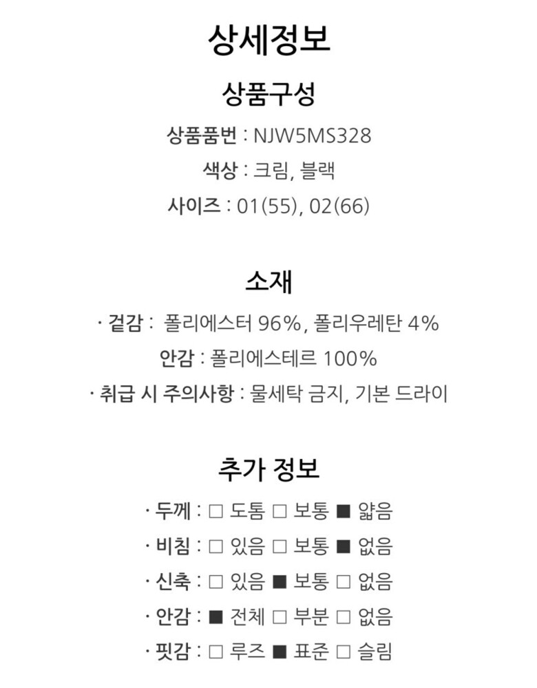 | 6. 세탁방법 및 취급시 주의사항 | 상품상세참조 |