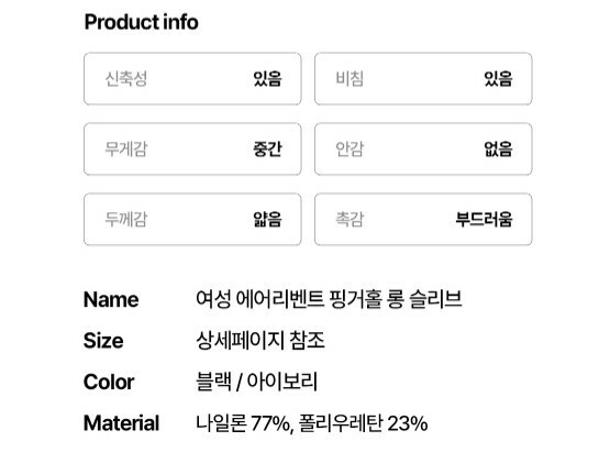| 1. 제품 소재 (섬유의 조성 또는 혼용률을 백분율로 표시, 기능성인 경우 성적서 또는 허가서) | 상품상세참조 |