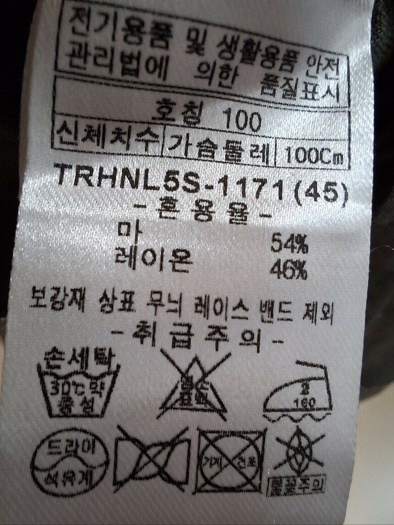 | 1. 제품 소재 (섬유의 조성 또는 혼용률을 백분율로 표시, 기능성인 경우 성적서 또는 허가서) | 마 54%, 레이온 46% |