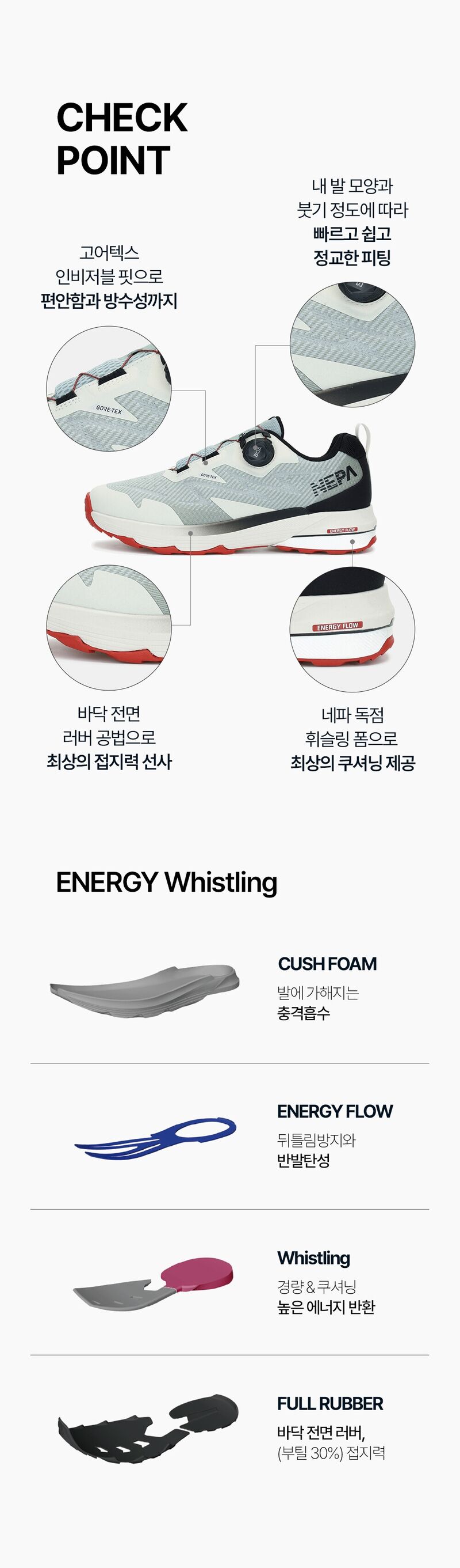 - 네파만의 ENERGY Whistling솔은 바닥 전면 부틸 고무 30% 함유되어 최상의 접지력 제공