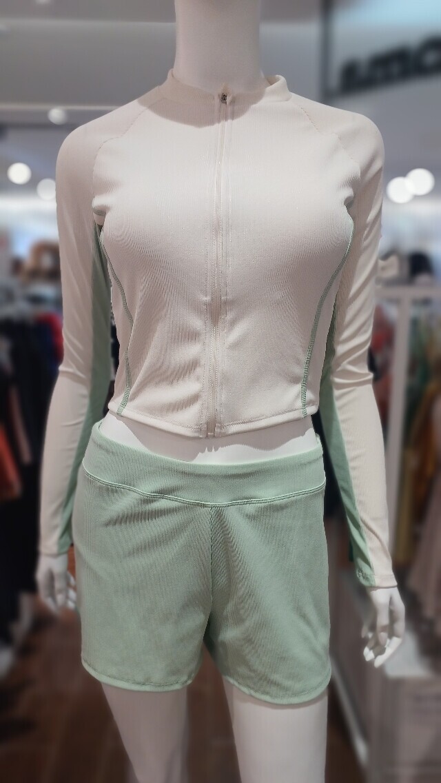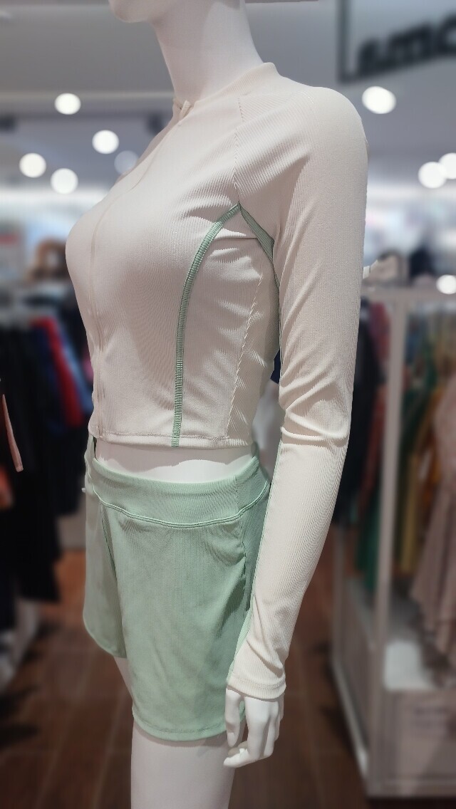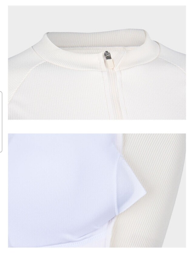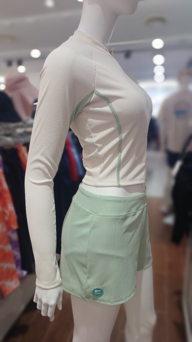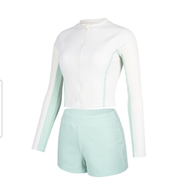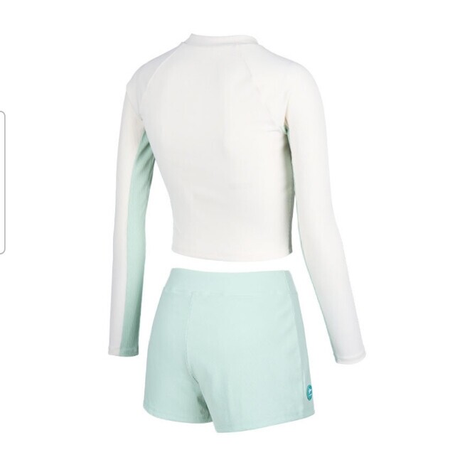 있는 안감 내장되어 있으며 하이 웨스트 팬츠는 이너팬티 내장되어 편하게 착용 가능한 골지 소재의 크롭 집업 래쉬가드세트입니다 .