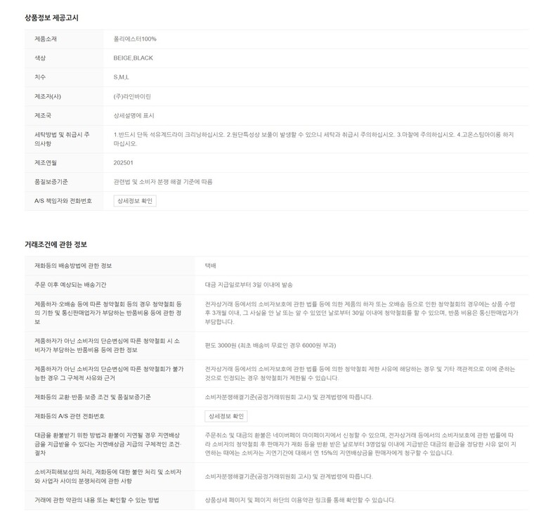 | 6. 세탁방법 및 취급시 주의사항 | 상품상세참조 |