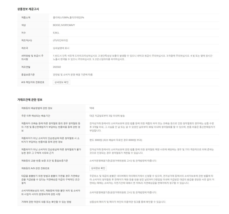 | 6. 세탁방법 및 취급시 주의사항 | 상품상세참조 |