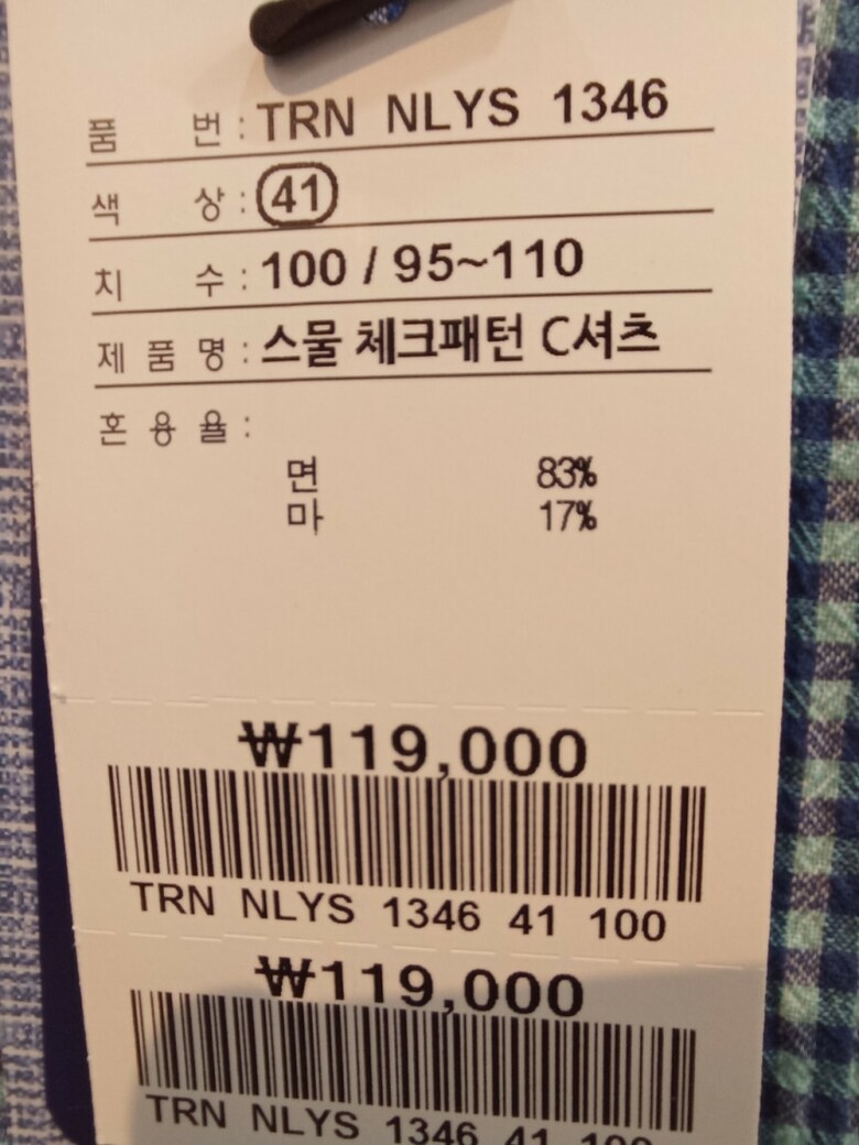 | 1. 제품 소재 (섬유의 조성 또는 혼용률을 백분율로 표시, 기능성인 경우 성적서 또는 허가서) | 면 83%, 마 17% |
